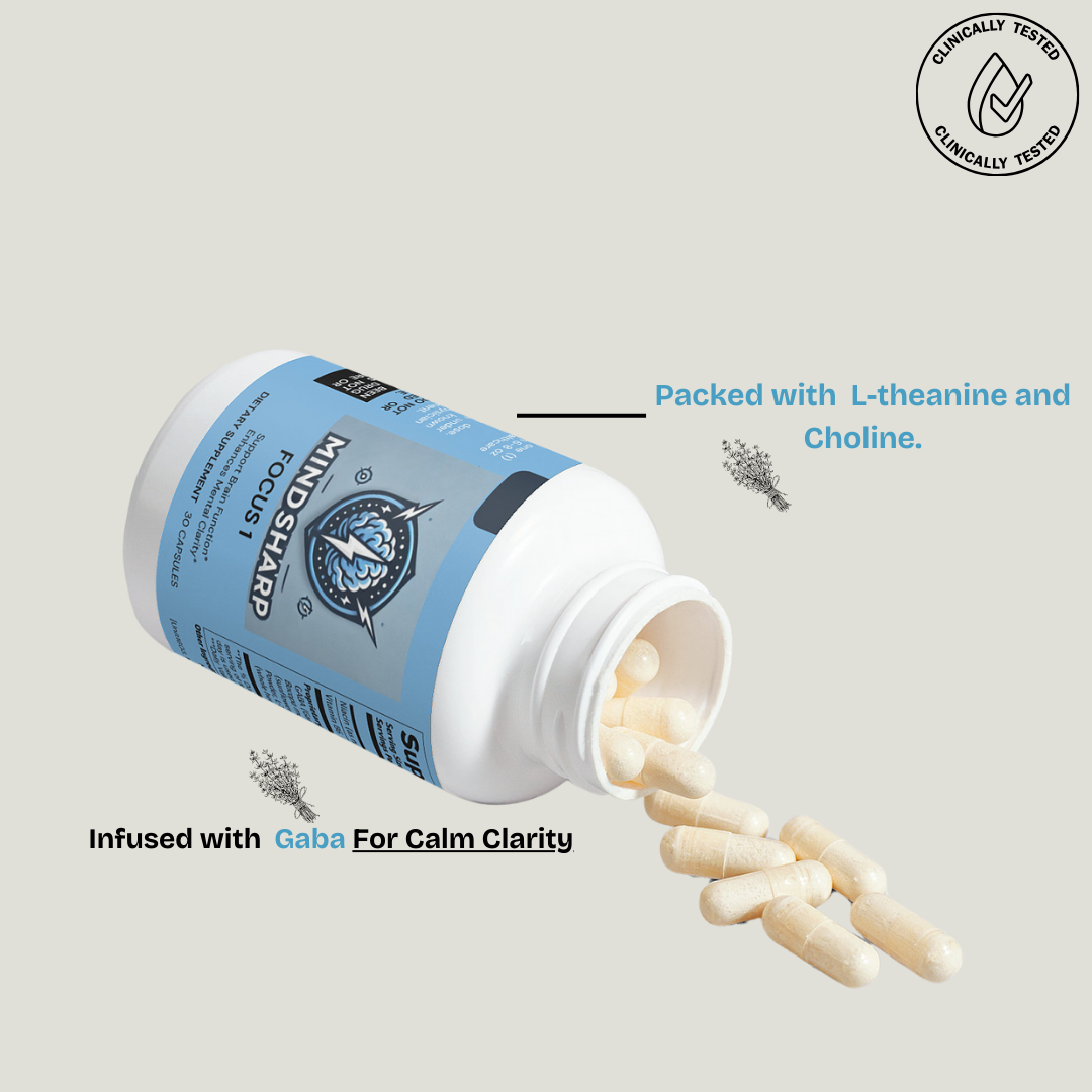 Experience unparalleled mental clarity and stress relief with MindSharp's Focus expertly formulated with natural ingredients like Niacin, Gingko Biloba and Gaba for sharper focus—your ultimate weapon against brain fog!